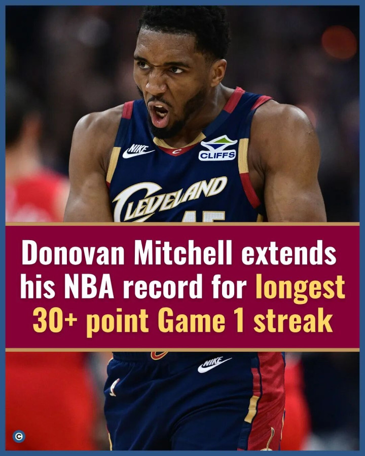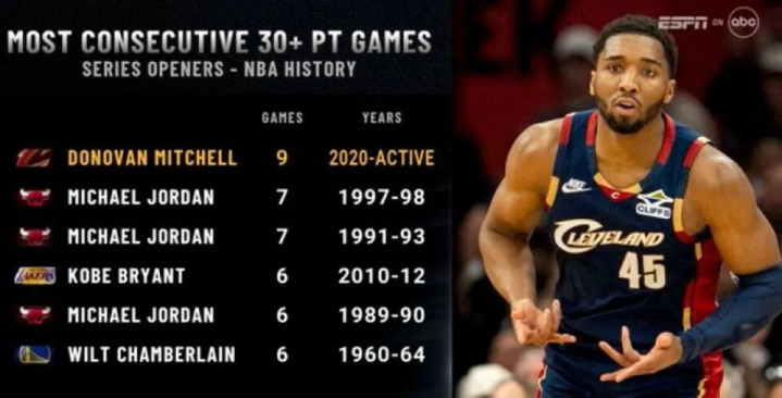但这场G1却别有一番意义,在本场拿到32分之后,米切尔已经连续9个系列赛G1拿到30+了,这一数字排在历史第一,纪录具体排名如下: