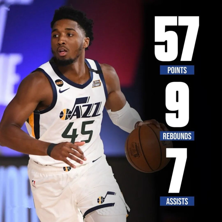 57分至今是现役球员的季后赛最高分,同时也是NBA季后赛历史第三高分和G1历史最高分,注意,当时的米切尔才三年级而已。