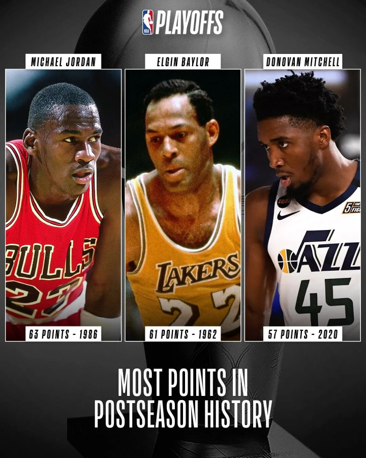 如果看高分的话更加疯狂,米切尔生涯一共在季后赛3次拿下50+,这一数字在NBA历史排在第三位,仅次于乔丹8次、张伯伦4次除了2020年首轮对阵掘金G1的单场57分之外,另外两场分别是: